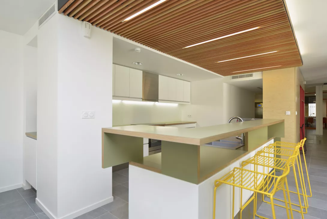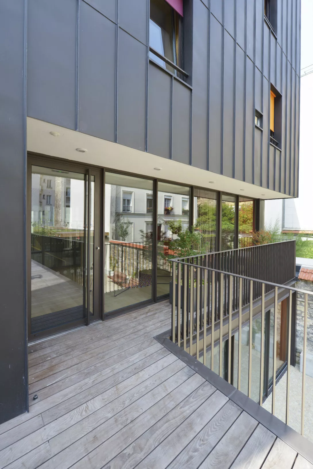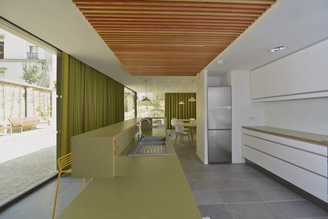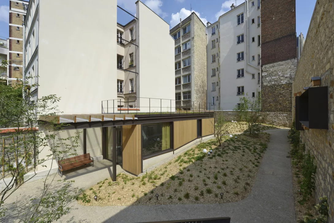 Réhabilitation et doublement de surface en extension du bâtiment. Les planchers du Bâtiment existant sont démolis et reconstruits. Le bâtiment jardin est réalisé en structure métallique avec toiture type plancher bac collaborant, isolé, étanché et végétalisé