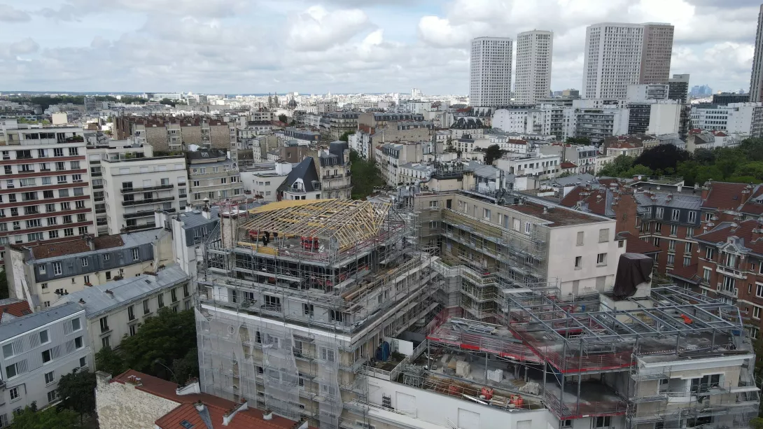 Création de 14 logements en surélévation et à la rénovation thermique et amélioration en milieu occupé de 3 immeubles totalisant 85 logements : - Réfection des pièces humides ; - Changement de la porte palière en rénovation ; - changement des menuiseries PVC ; - Mise en sécurité des logements