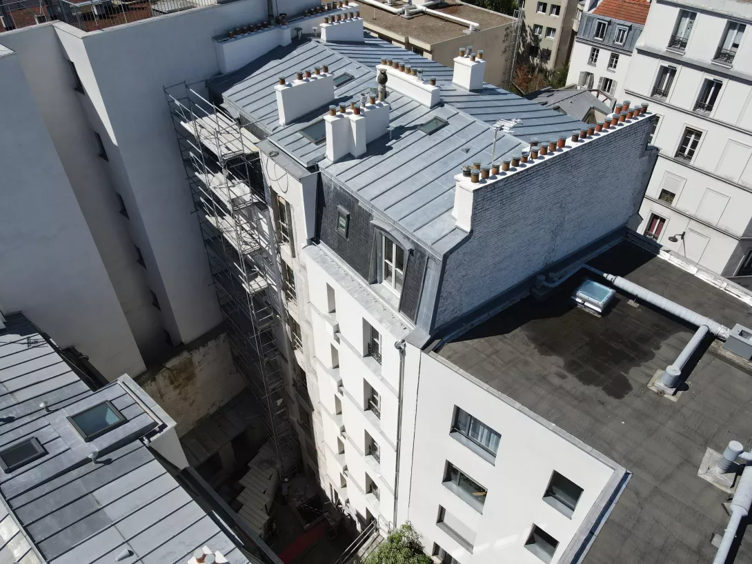 Réhabilitation de 2 immeubles (R+4 et R+6) composés de 26 logements et 3 commerces. Travaux en tout corps d'état en milieu semi-occupé – Création ascenseur extérieur pour le R+6 SHAB : 1 398m²
